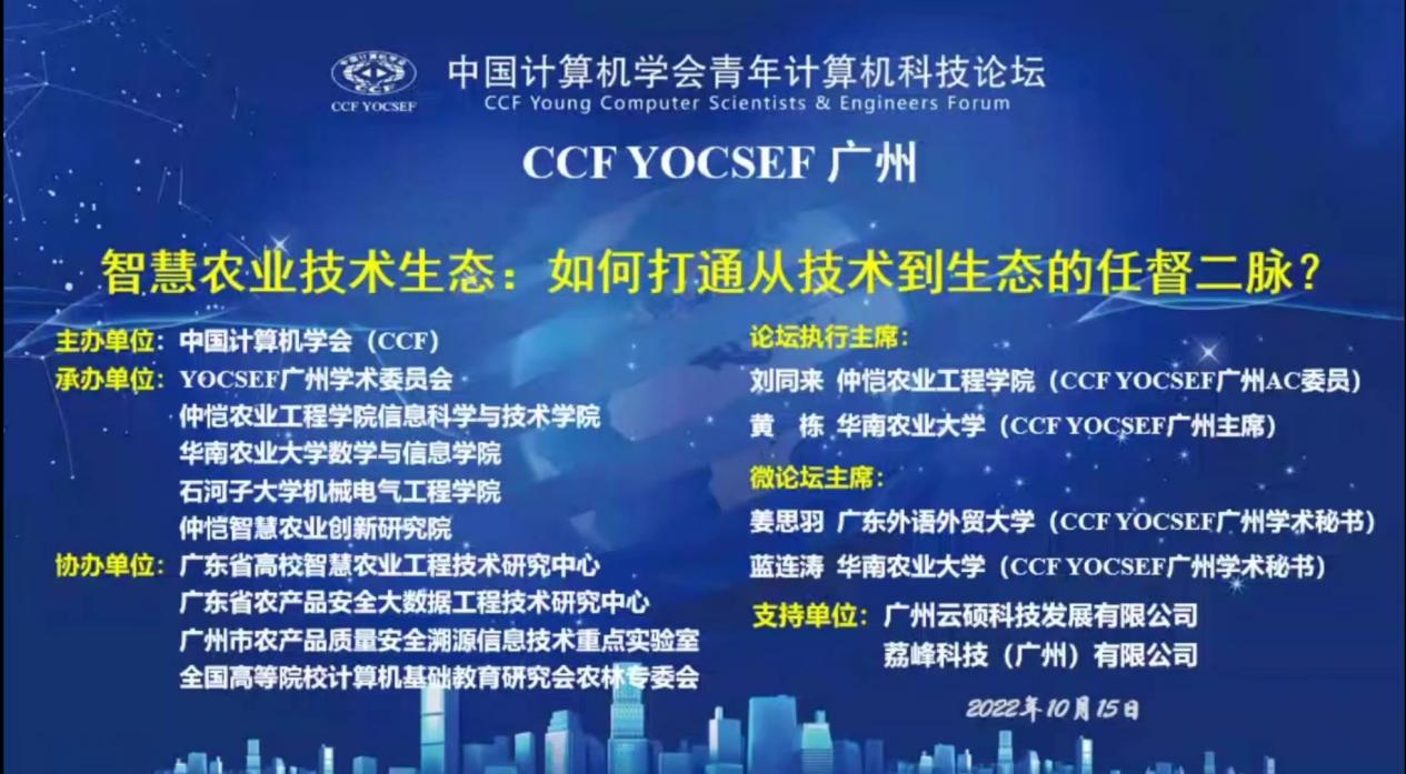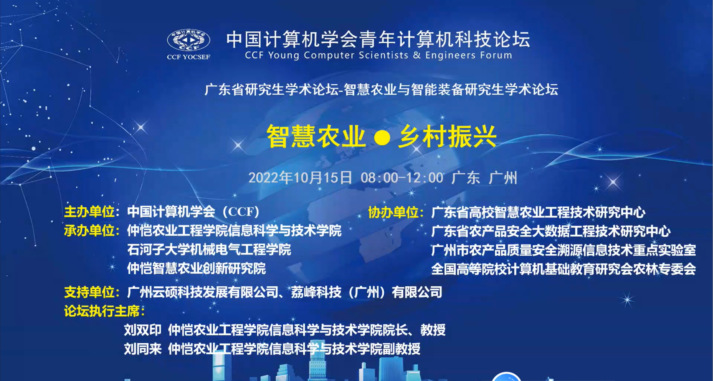 此次论坛由中国计算机学会(CCF)主办,仲恺农业工程学院信息科学与技术学院、华南农业大学数学与信息学院、石河子大学机械电气工程学院、仲恺智慧农业创新研究院共同承办,广东省高校智慧农业工程技术研究中心、广东省农产品安全大数据工程技术研究中心、广州市农产品质量安全溯源信息技术重点实验室和全国高等院校计算机基础教育研究会农林专委会协办。仲恺农业工程学院信息科学与技术学院院长刘双印教授和刘同来副教授担任“智慧农业乡村振兴”论坛执行主席,YOCSEF广州主席黄栋(华南农业大学)和YOCSEF广州AC委员刘同来副教授(仲恺农业工程学院)担任“智慧农业技术生态:如何打通从技术到生态的任督二脉?”论坛执行主席。广州云硕科技发展有限公司和荔峰科技(广州)有限公司为此次活动提供了赞助支持。