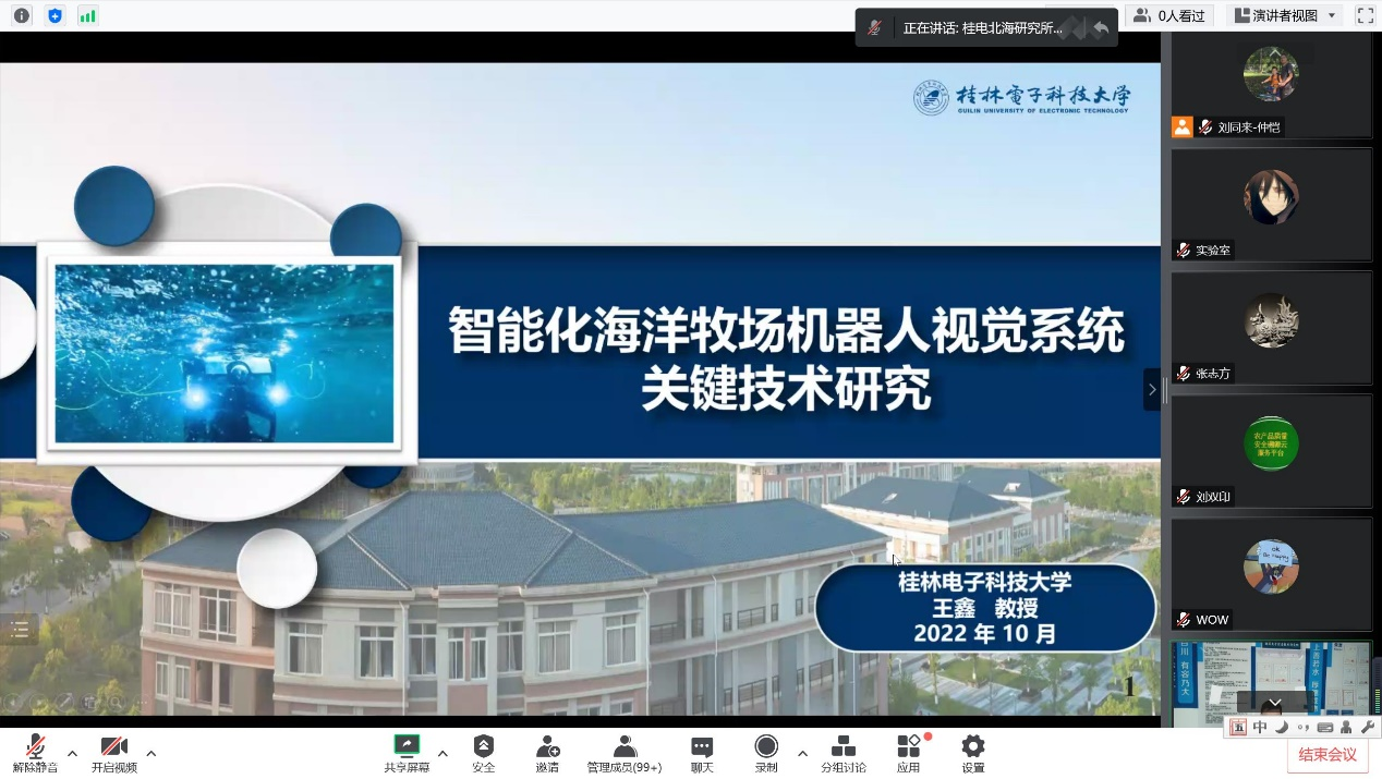 在“智慧农业乡村振兴”论坛环节,国家农业信息技术研究中心杨信廷研究员、上海海洋大学袁红春教授、桂林电子科技大学王鑫教授、温氏集团云浮市物联网研究院有限公司郭杰总经理、仲恺农业工程学院信息科学与技术学院院长 刘双印教授围绕“智慧农业乡村振兴”的若干议题分别作了精彩的报告。杨信廷研究员以“对智慧农业的学习和思考”为题,概述了国内外智慧农业战略、发展现状和趋势,分析了我国与发达国家在智慧农业发展之间的差距及存在的问题,并结合具体的智慧农业应用案例总结了我国智慧农业的发展技术路线。袁红春教授以“智能化水产养殖服务平台关键技术研究与实践”为题,介绍了我国水产养殖业面临的问题和挑战、未来的发展方向,汇报课题组在智能化水产养殖服务平台建设方面所开展的相关研究与实并提出了未来的研究方向。王鑫教授以“智能化海洋牧场机器人视觉系统关键技术研究”为题,从国内外研究现状出发概述了机器人视觉研究的科技价值和应用价值,并针对水下捕捞作用中机器视觉的质量退化、运动退化等难题介绍了水下图像超分辨、无监督目标检测水下视觉环节感知技术。郭杰总经理以“县域数字农业解决方案和发展路径探索”为题,概述了何为数字农业,通过具体的县域数字农业建设案例探索县域数字农业的发展路径。刘双印教授以“数智乡村引领乡村振兴”为题,对数智乡村建设存在的一些问题及关键技术进行了分析,介绍了数字乡村引领乡村振兴的主要途径及仲恺农业工程学院在数字乡村建设方面所做的工作。