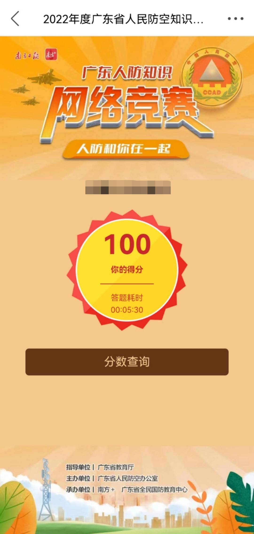 为深入开展国防教育及征兵宣传工作,我院积极发动学生参加2022年防空知识网络竞赛,通过线上班级主题班会广泛发动、积极宣传,通过防空知识网络竞赛扩大征兵宣传影响力和辐射面,增强学生国防意识,激发学生参军入伍热情,进一步深化了爱国主义教育。
