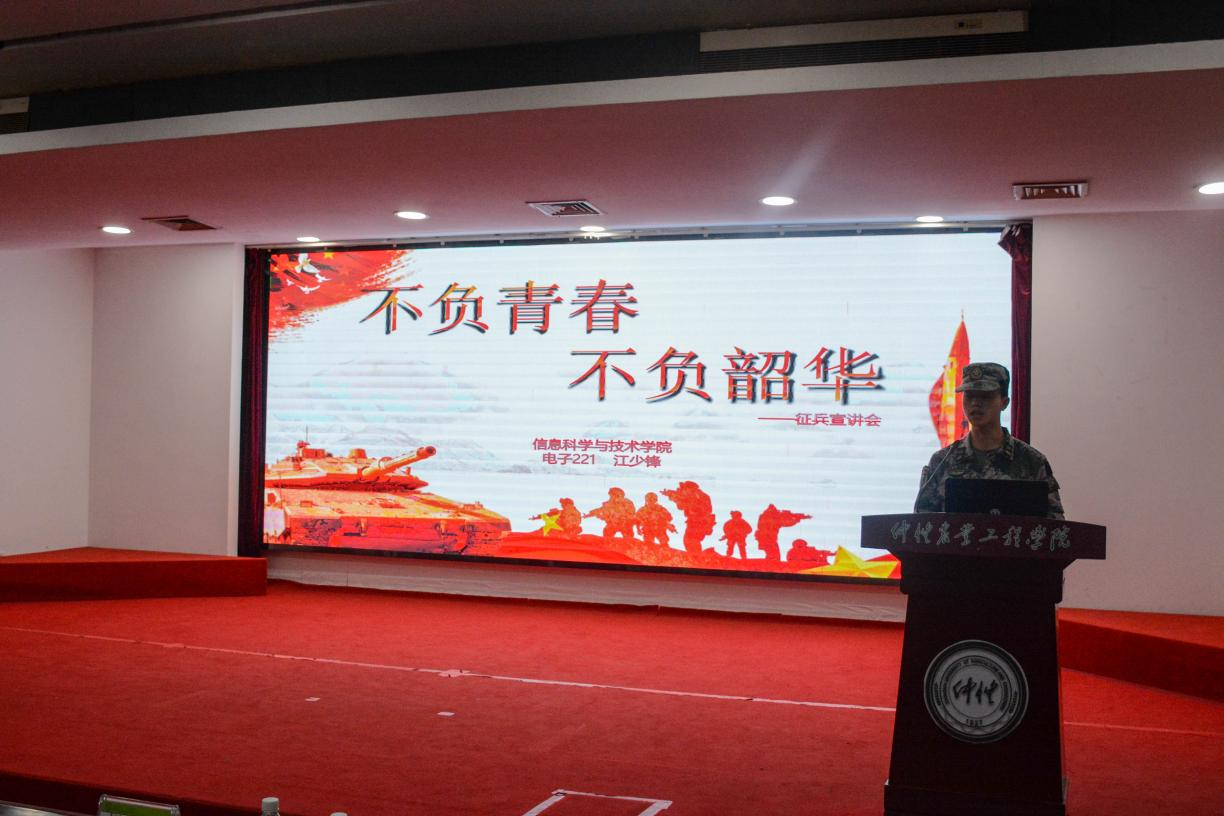 最后,电子221江少锋同学以“不负青春,不负韶华”为主题进行征兵宣传,讲诉自己的亲身经历,为同学们介绍了丰富多彩的军旅生活,对征兵政策进行了详细解读,以及大学生入伍后可享有的优先考学提拔、补偿学费,退役后享受就学就业优惠等优扶政策。