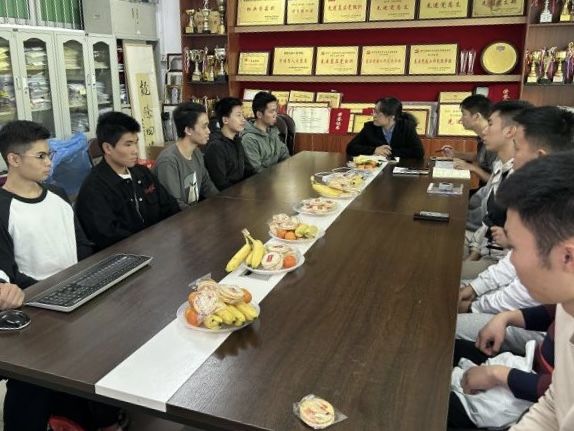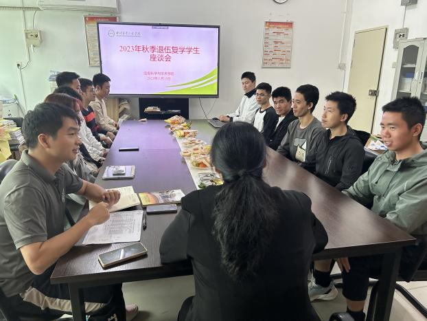 接着,退伍复学同学介绍了自己退伍复学后的学习适应情况,从入伍缘由、参军待遇、军旅生活及从军收获等方面介绍了个人参军经历。分享自己的军旅生活和退役复学后的感受。并表达了对提供帮助的老师和同学们的感谢。随后,从学习、生活等方面讲述了退伍复学后遇到的困难和问题。虽然部队生活和学校生活有很大差异,但同学们还是表示有迎难而上的信心,把在部队里学到的特别能吃苦,特别能耐劳的精神发扬到大学的学习和生活里。