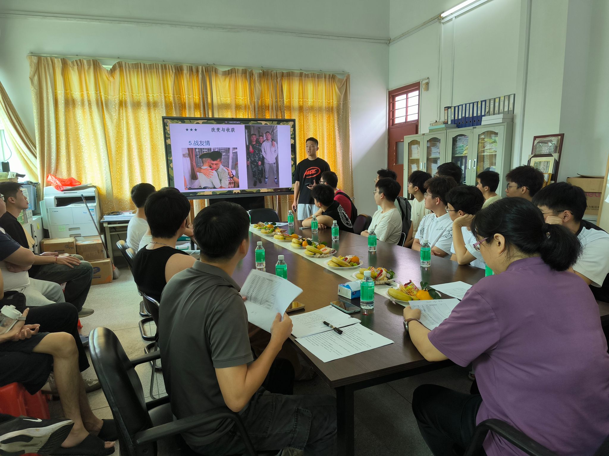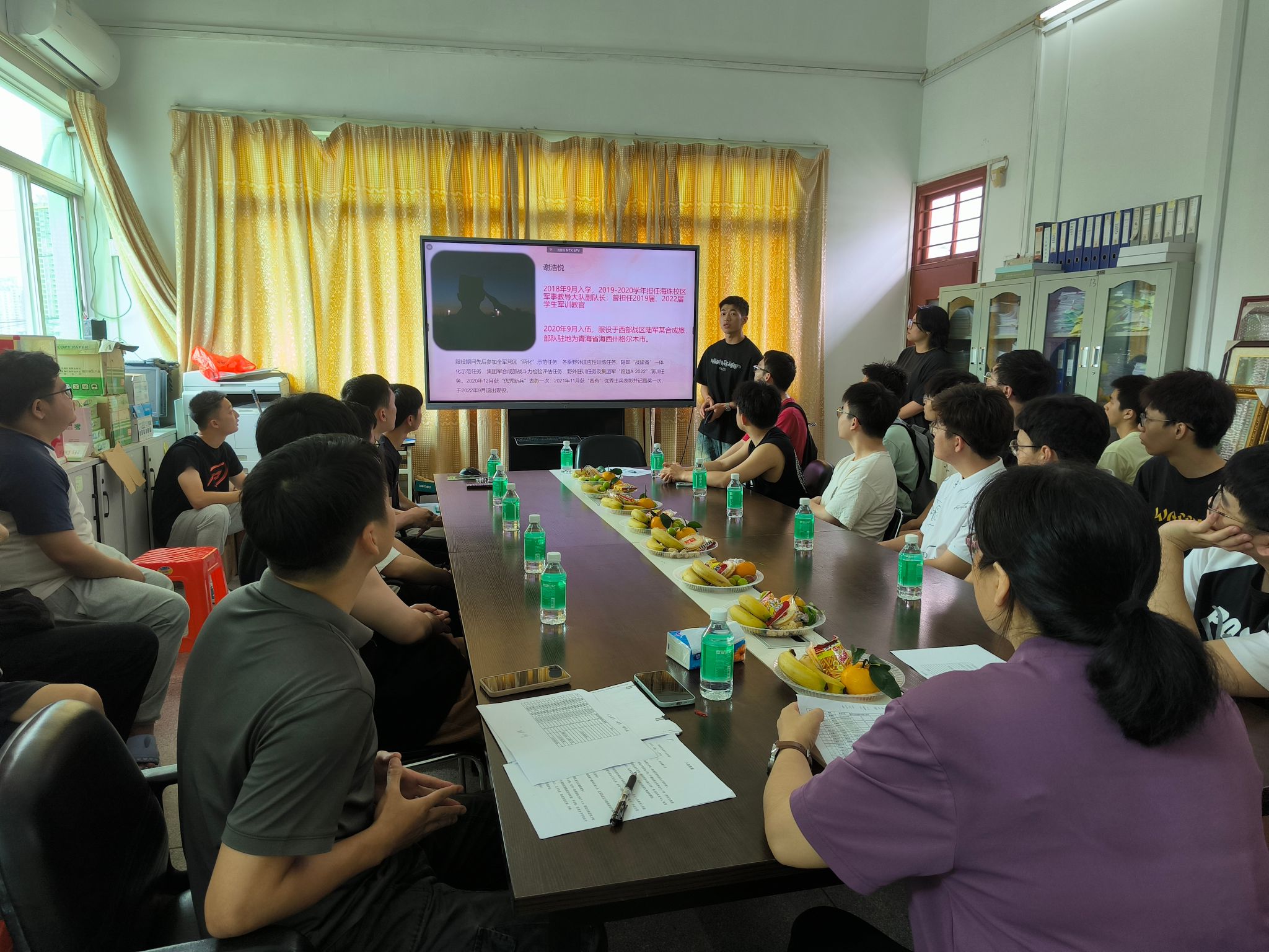 接着,优秀退伍学生代表为大家做了经验分享,他们从入伍缘由、军旅生活、从军收获以及参军待遇这几个方面向大家介绍了个人参军经历。将个人在军队中的成长与收获结合国家入伍优待政策,以切身体会进行了生动的讲解与分享,让本次参加座谈会的师生对军营有了更进一步的认识,也让即将毕业的同学们对军营充满了向往。