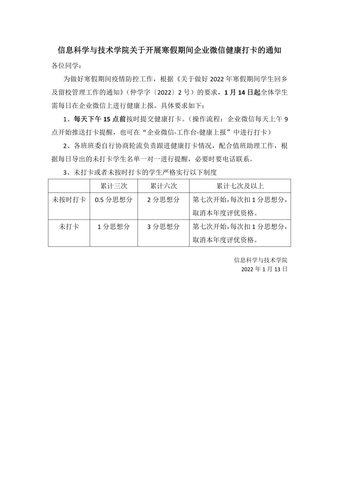信息科学与技术学院关于开展寒假期间企业微信健康打卡的通知