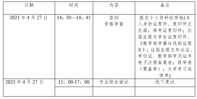 复试采取线下面试的方式进行。综合面试内容含治学态度、专业知识、心理素质、语言表达与交际交流能力、思维应变能力、英语口语等综合素质和培养潜力,每名考生面试时间不少于20分钟。