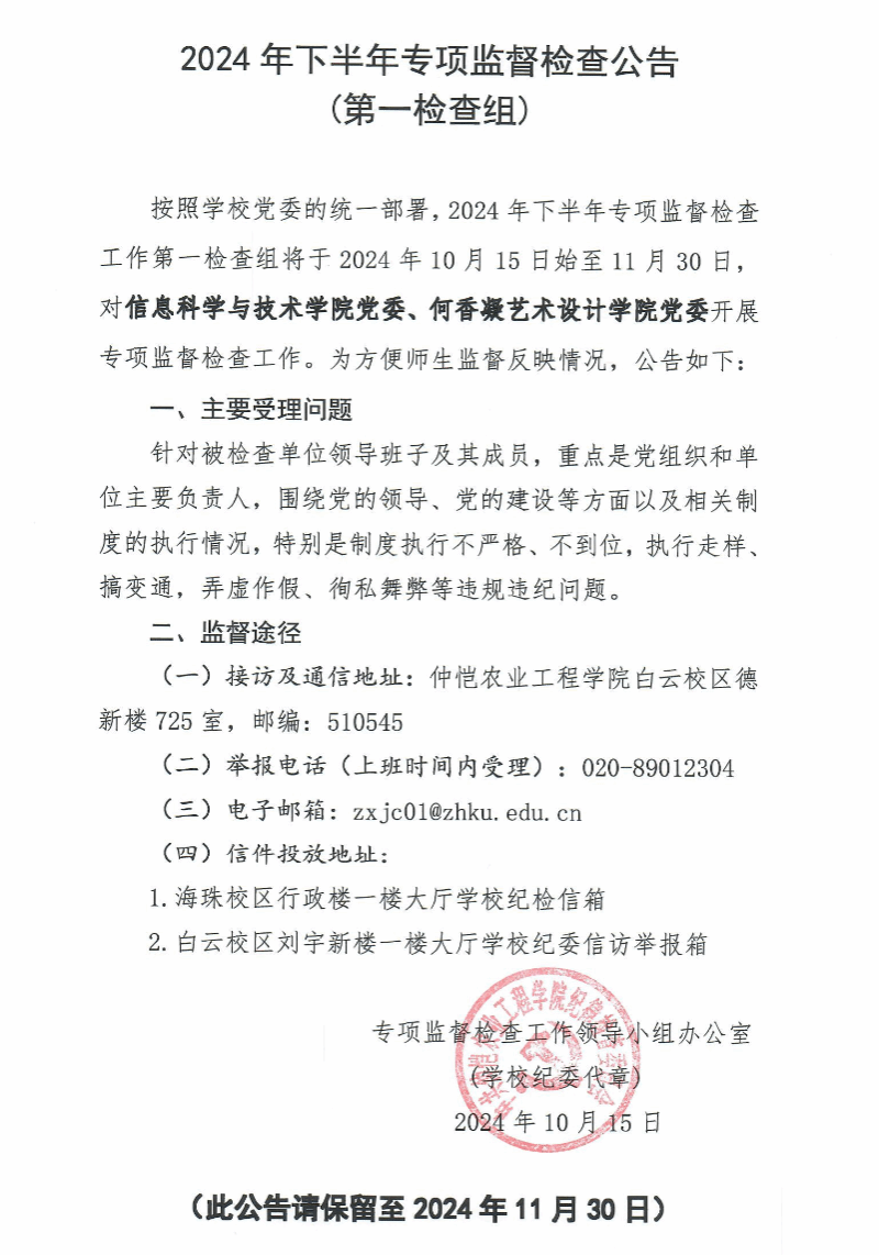 2024年下半年专项监督检查公告(第一检查组)