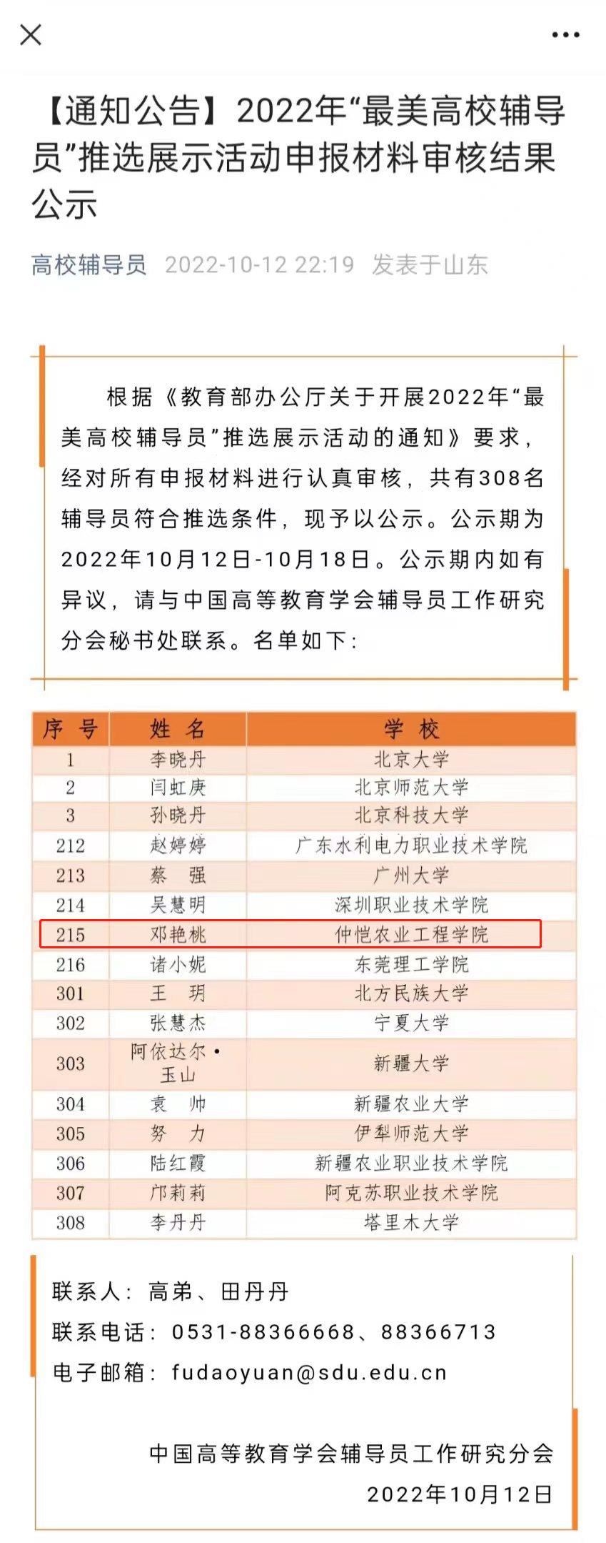 近日,根据《教育部办公厅关于开展2022年“最美高校辅导员”推选展示活动的通知》推选展示活动申报材料审核结果公示,我院辅导员邓艳桃进入全国2022年308名“最美高校辅导员”推选之列。